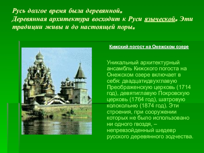 Уникальный архитектурный ансамбль Кижского погоста на Онежском озере включает в себя: двадцатидвухглавую Преображенскую церковь (1714 год), девятиглавую Покровскую церковь (1764 год), шатровую колокольню (1874 год). Эти строения, при сооружении которых не было использовано ни одного гвоздя, – непревзойденный шедевр русского деревянного зодчества.
