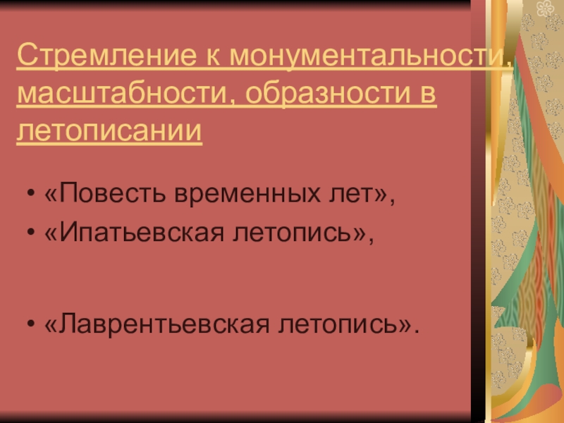 Слайд 4Стремление к монументальности, масштабности, образности в летописании