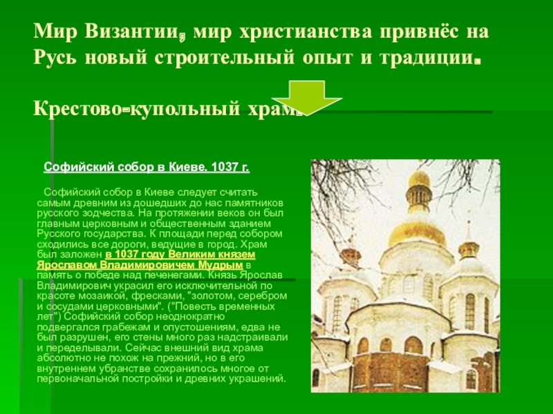 Слайд 25Мир Византии, мир христианства привнёс на Русь новый строительный опыт и