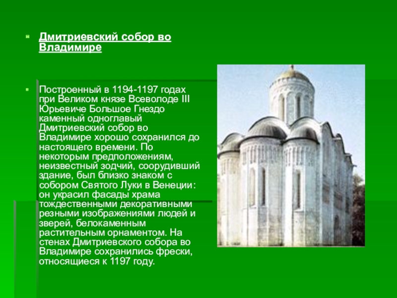 III Юрьевиче Большое Гнездо каменный одноглавый Дмитриевский собор во Владимире хорошо сохранился до настоящего времени. По некоторым предположениям, неизвестный зодчий, соорудивший здание, был близко знаком с собором Святого Луки в Венеции: он украсил фасады храма тождественными декоративными резными изображениями людей и зверей, белокаменным растительным орнаментом. На стенах Дмитриевского собора во Владимире сохранились фрески, относящиеся к 1197 году.