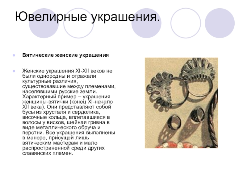 отражали культурные различия, существовавшие между племенами, населявшими русские земли. Характерный пример – украшения женщины-вятички (конец XI-начало XII века). Они представляют собой бусы из хрусталя и сердолика, височные кольца, вплетавшиеся в волосы у висков, шейная гривна в виде металлического обруча и перстни. Все украшения выполнены в манере, присущей лишь вятическим мастерам и мало распространенной среди других славянских племен.