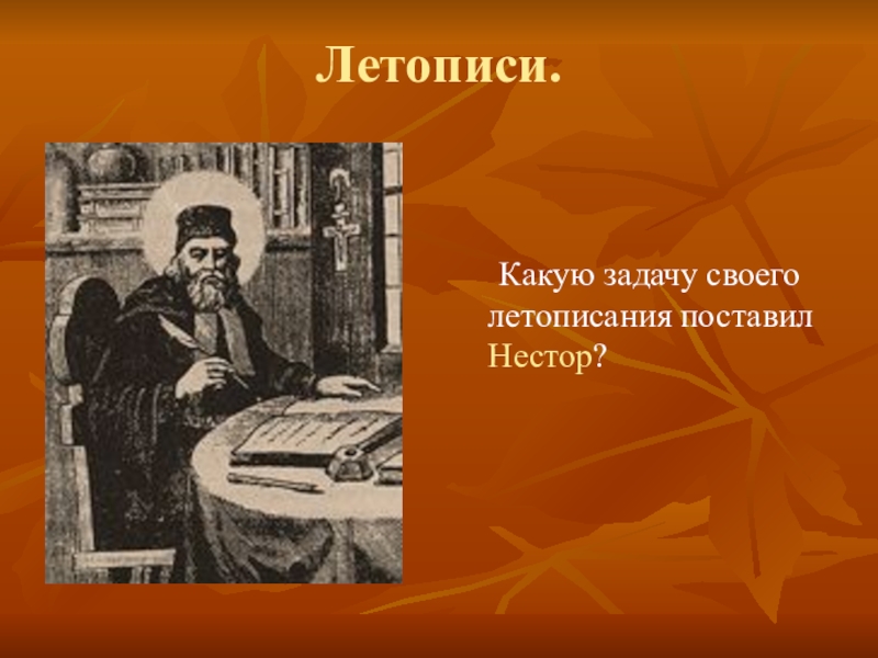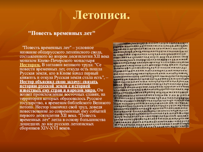 составленного во втором десятилетии XII века монахом Киево-Печерского монастыря Нестором. В заглавии великого труда: "Се повести временных лет, откуда есть пошла Русская земля, кто в Киеве начал первый княжить и откуда Русская земля стала есть", – Нестор объяснил свою задачу: связать историю русской земли с историей известных ему стран и народов мира. Он возвел происхождение восточных славян, на территории которых образовалось Русское государство, к временам библейского Великого потопа. Нестор закончил свой труд, доведя повествование до современных ему событий первого десятилетия XII века. "Повесть временных лет" легла в основу большинства дошедших до нас русских летописных сборников XIV-XVI веков.