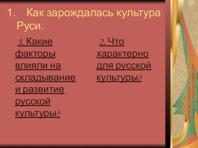 Слайд 2Какие факторы влияли на складывание и развитие русской культуры?
