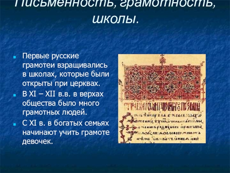 С XI в. в богатых семьях начинают учить грамоте девочек.