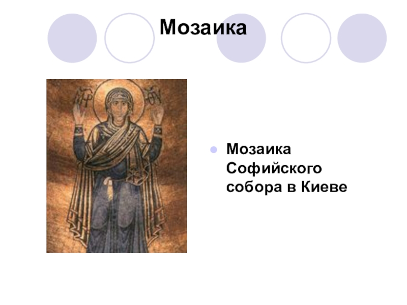 Софийский собор в Киеве следует считать самым древним из дошедших до нас памятников русского зодчества. На протяжении веков он был главным церковным и общественным зданием Русского государства. К площади перед собором сходились все дороги, ведущие в город. Храм был заложен в 1037 году Великим князем Ярославом Владимировичем Мудрым в память о победе над печенегами. Князь Ярослав Владимирович украсил его исключительной по красоте мозаикой, фресками, "золотом, серебром и сосудами церковными". ("Повесть временных лет") Софийский собор неоднократно подвергался грабежам и опустошениям, едва не был разрушен, его стены много раз надстраивали и переделывали. Сейчас внешний вид храма абсолютно не похож на прежний, но в его внутреннем убранстве сохранилось многое от первоначальной постройки и древних украшений.