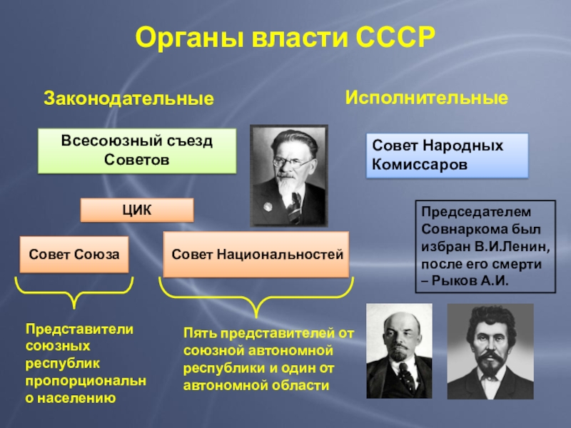 Председателем Совнаркома был избран В.И.Ленин, после его смерти – Рыков А.И.