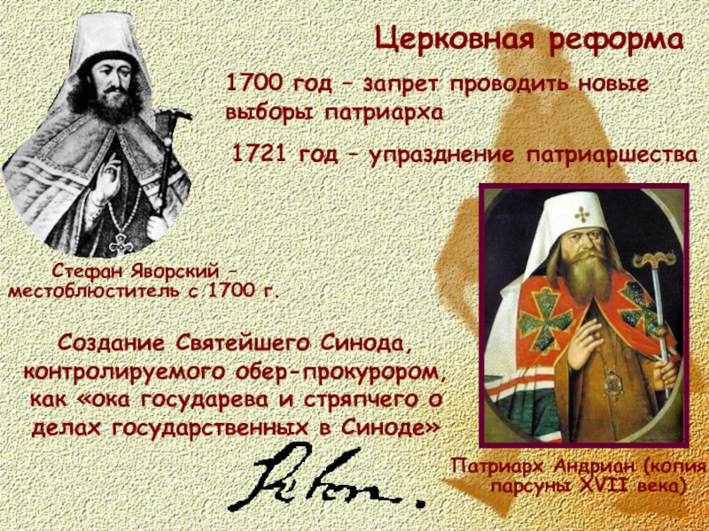 Создание Святейшего Синода, контролируемого обер-прокурором, как «ока государева и стряпчего о делах государственных в Синоде»