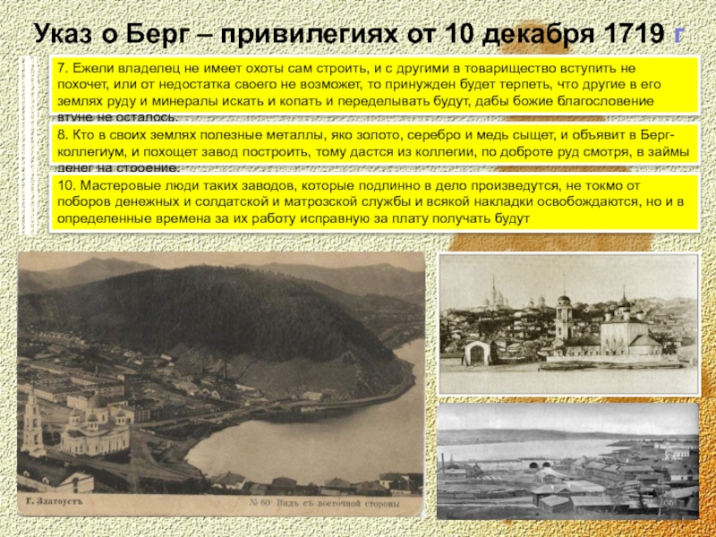 8. Кто в своих землях полезные металлы, яко золото, серебро и медь сыщет, и объявит в Берг-коллегиум, и похощет завод построить, тому дастся из коллегии, по доброте руд смотря, в займы денег на строение.