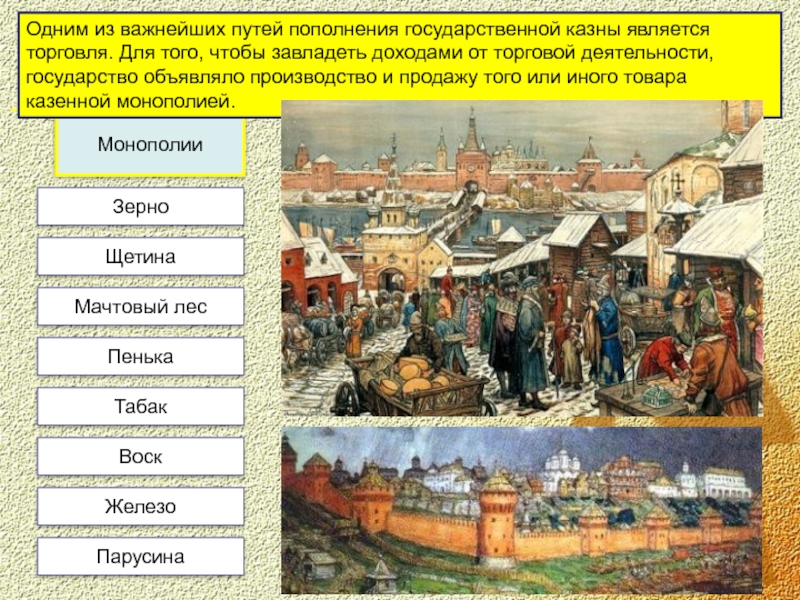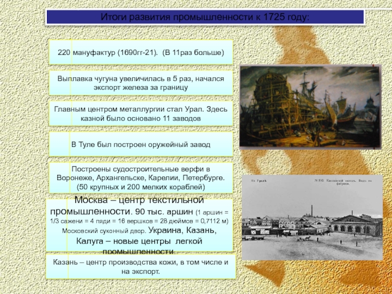 Москва – центр текстильной промышленности. 90 тыс. аршин (1 аршин = 1/3 сажени = 4 пяди = 16 вершков = 28 дюймов = 0,7112 м) Московский суконный двор. Украина, Казань, Калуга – новые центры легкой промышленности.