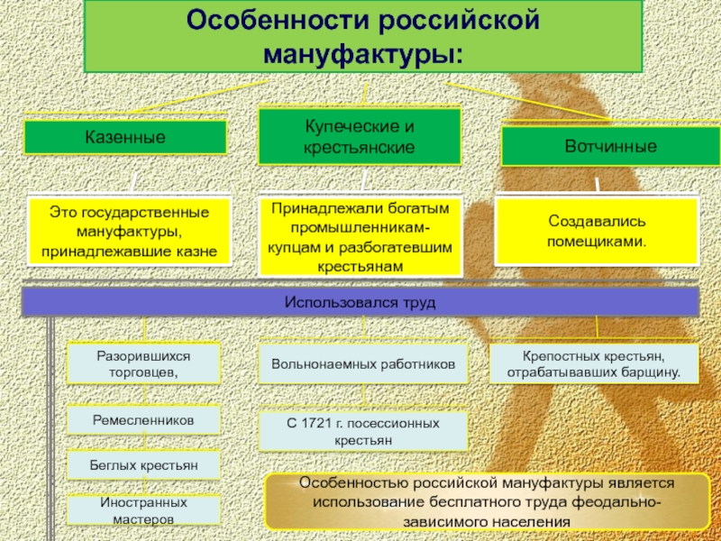 Особенностью российской мануфактуры является использование бесплатного труда феодально-зависимого населения
