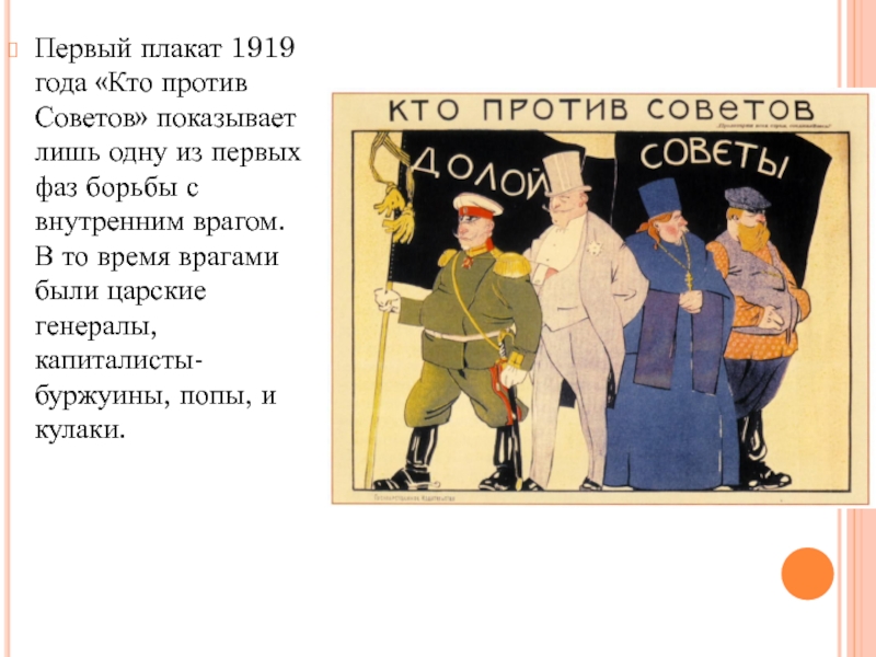 Первый плакат 1919 года «Кто против Советов» показывает лишь одну из первых фаз борьбы с внутренним врагом. В то время врагами были царские генералы, капиталисты-буржуины, попы, и кулаки.