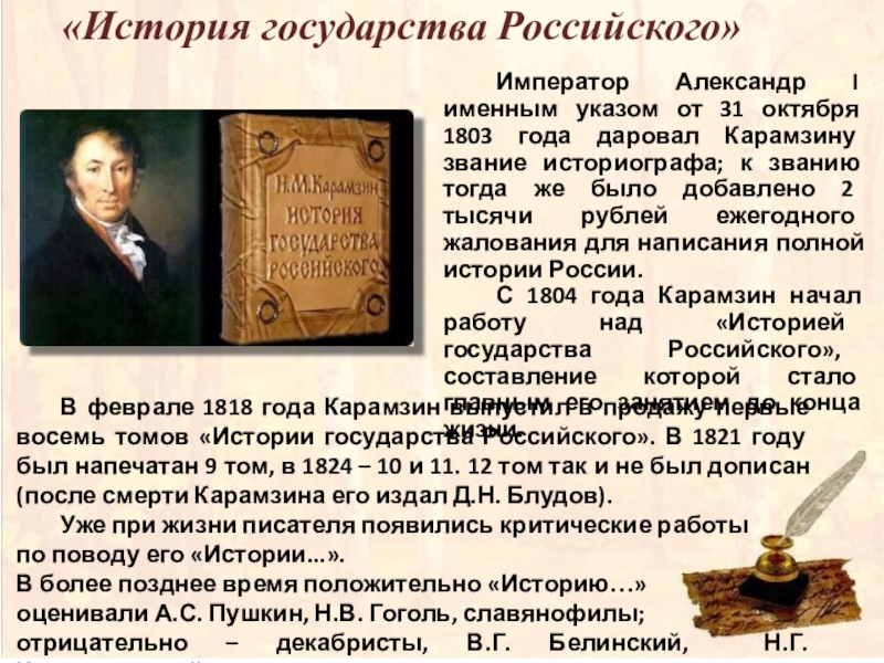 Император Александр I именным указом от 31 октября 1803 года даровал Карамзину звание историографа; к званию тогда же было добавлено 2 тысячи рублей ежегодного жалования для написания полной истории России.