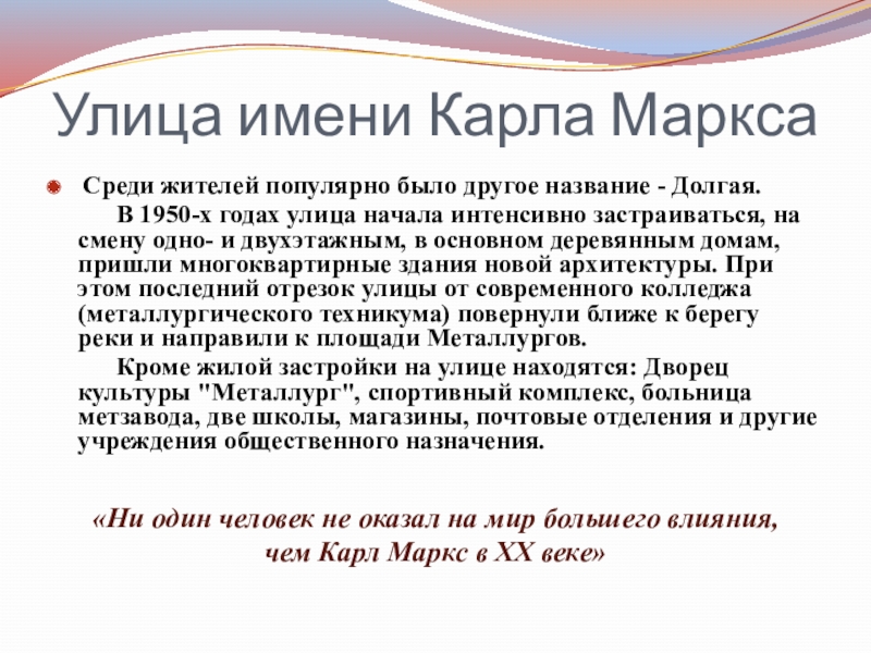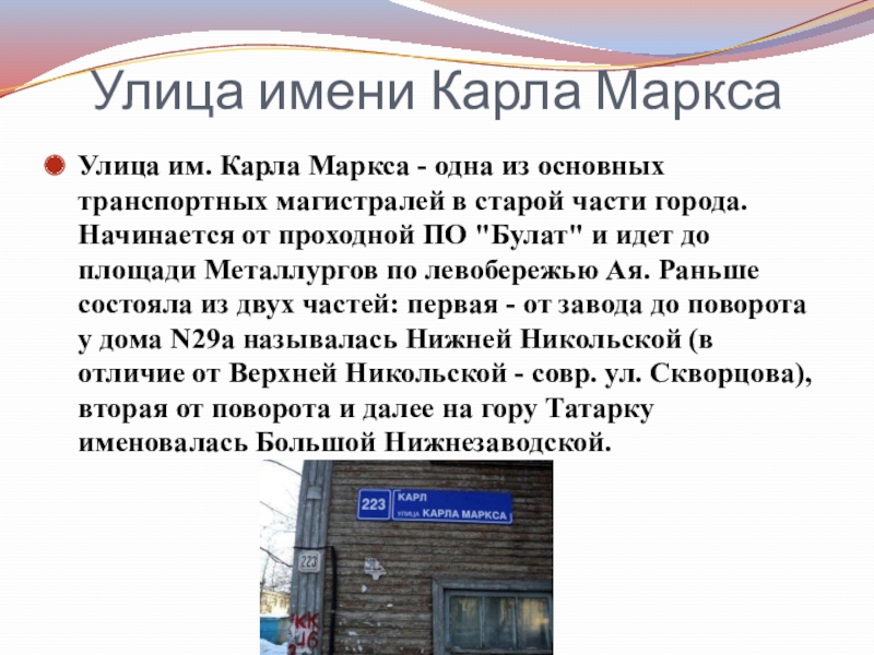 Презентация, доклад по теме: Улица имени Карла Маркса.Курс внеурочных занятий Я - Златоустовец.