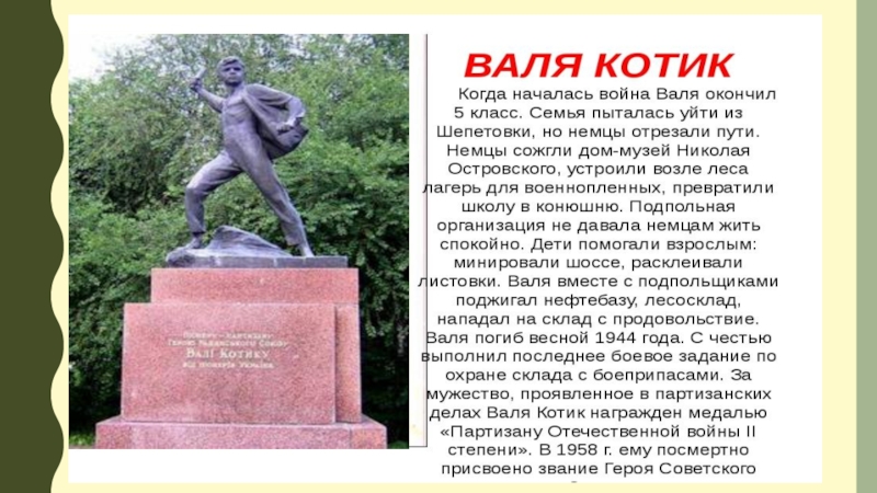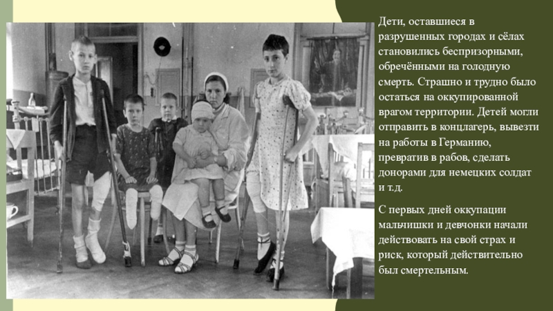 Дети, оставшиеся в разрушенных городах и сёлах становились беспризорными, обречёнными на голодную смерть. Страшно и трудно было остаться на оккупированной врагом территории. Детей могли отправить в концлагерь, вывезти на работы в Германию, превратив в рабов, сделать донорами для немецких солдат и т.д.