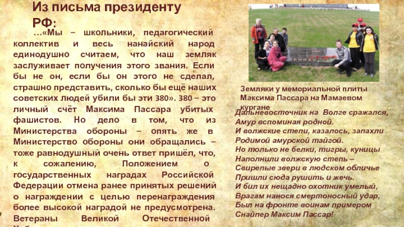 Земляки у мемориальной плиты Максима Пассара на Мамаевом кургане