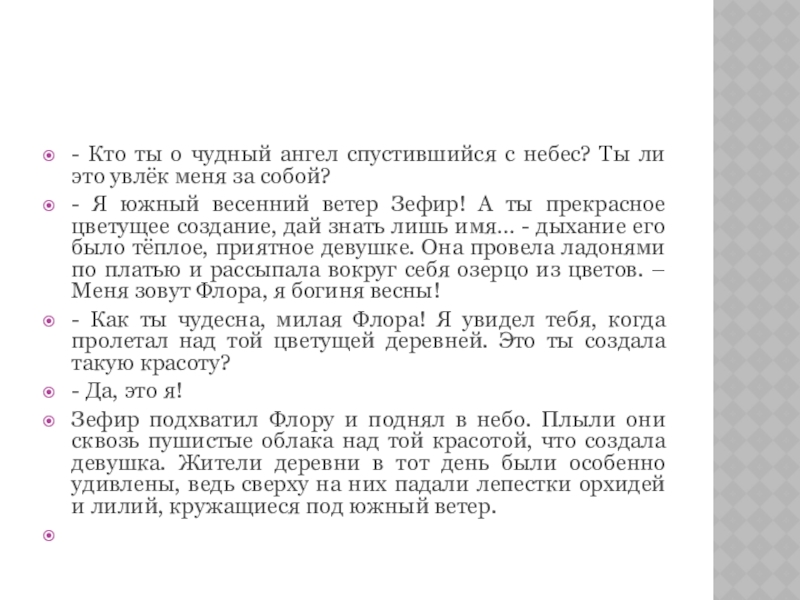 - Я южный весенний ветер Зефир! А ты прекрасное цветущее создание, дай знать лишь имя… - дыхание его было тёплое, приятное девушке. Она провела ладонями по платью и рассыпала вокруг себя озерцо из цветов. – Меня зовут Флора, я богиня весны!