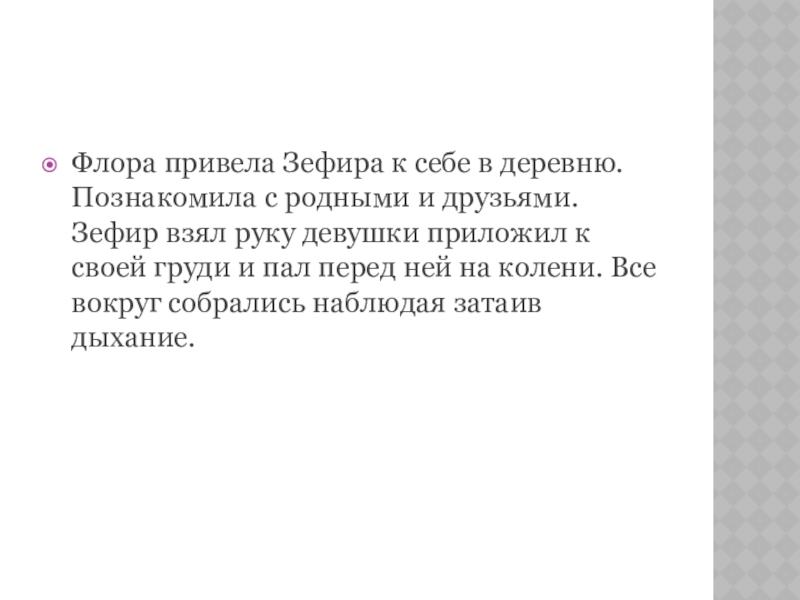 Слайд 7Флора привела Зефира к себе в деревню. Познакомила с родными и