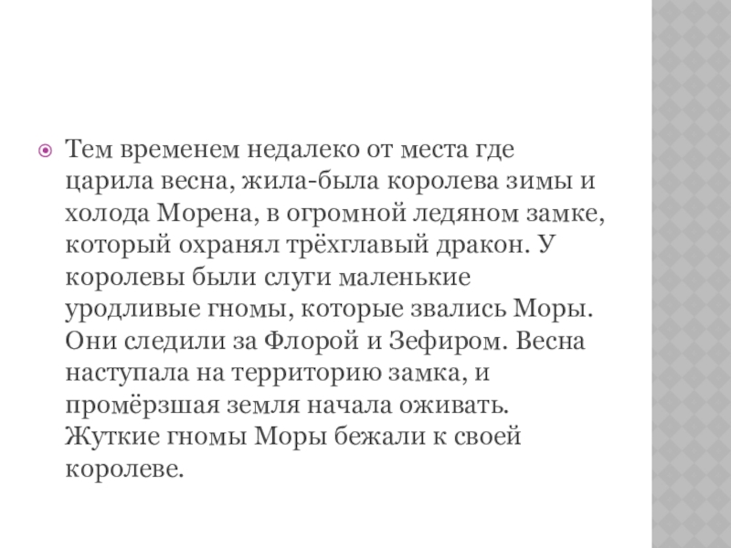 и холода Морена, в огромной ледяном замке, который охранял трёхглавый дракон. У королевы были слуги маленькие уродливые гномы, которые звались Моры. Они следили за Флорой и Зефиром. Весна наступала на территорию замка, и промёрзшая земля начала оживать. Жуткие гномы Моры бежали к своей королеве.