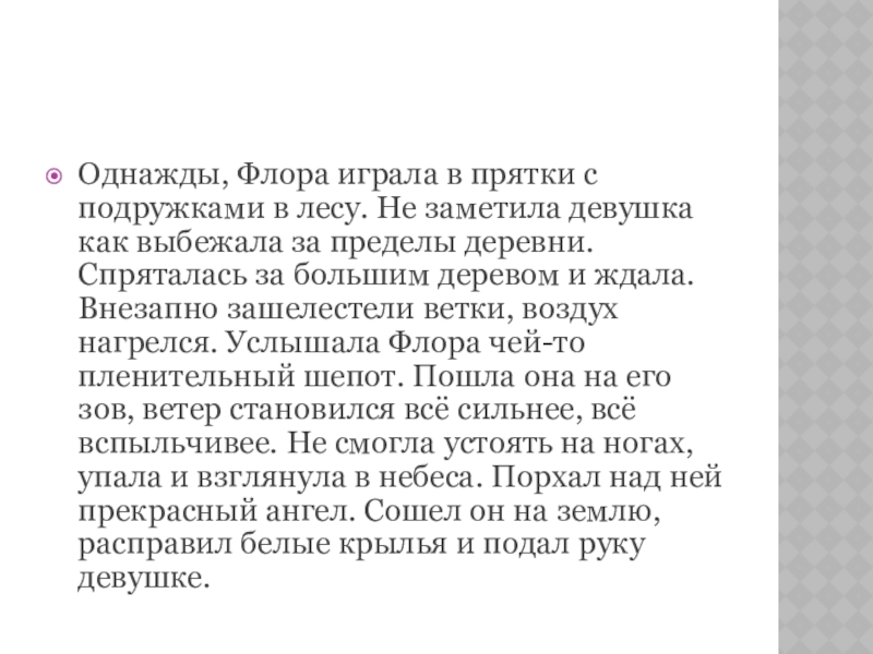 девушка как выбежала за пределы деревни. Спряталась за большим деревом и ждала. Внезапно зашелестели ветки, воздух нагрелся. Услышала Флора чей-то пленительный шепот. Пошла она на его зов, ветер становился всё сильнее, всё вспыльчивее. Не смогла устоять на ногах, упала и взглянула в небеса. Порхал над ней прекрасный ангел. Сошел он на землю, расправил белые крылья и подал руку девушке.
