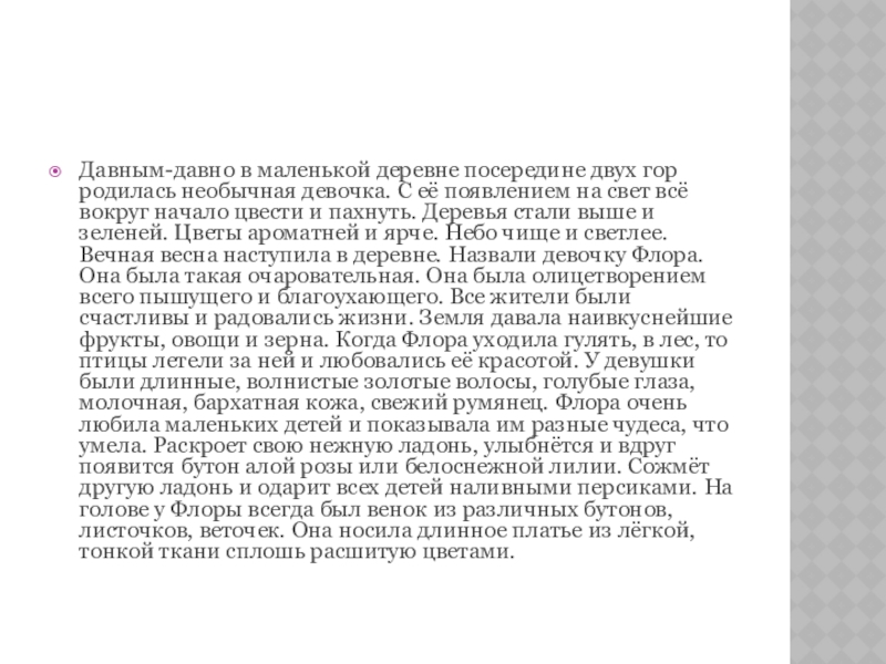 её появлением на свет всё вокруг начало цвести и пахнуть. Деревья стали выше и зеленей. Цветы ароматней и ярче. Небо чище и светлее. Вечная весна наступила в деревне. Назвали девочку Флора. Она была такая очаровательная. Она была олицетворением всего пышущего и благоухающего. Все жители были счастливы и радовались жизни. Земля давала наивкуснейшие фрукты, овощи и зерна. Когда Флора уходила гулять, в лес, то птицы летели за ней и любовались её красотой. У девушки были длинные, волнистые золотые волосы, голубые глаза, молочная, бархатная кожа, свежий румянец. Флора очень любила маленьких детей и показывала им разные чудеса, что умела. Раскроет свою нежную ладонь, улыбнётся и вдруг появится бутон алой розы или белоснежной лилии. Сожмёт другую ладонь и одарит всех детей наливными персиками. На голове у Флоры всегда был венок из различных бутонов, листочков, веточек. Она носила длинное платье из лёгкой, тонкой ткани сплошь расшитую цветами.