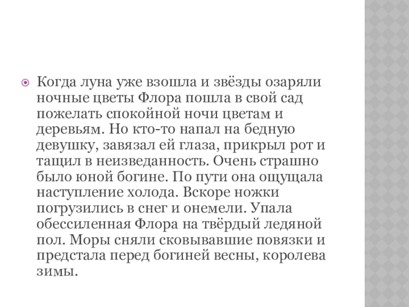 в свой сад пожелать спокойной ночи цветам и деревьям. Но кто-то напал на бедную девушку, завязал ей глаза, прикрыл рот и тащил в неизведанность. Очень страшно было юной богине. По пути она ощущала наступление холода. Вскоре ножки погрузились в снег и онемели. Упала обессиленная Флора на твёрдый ледяной пол. Моры сняли сковывавшие повязки и предстала перед богиней весны, королева зимы.