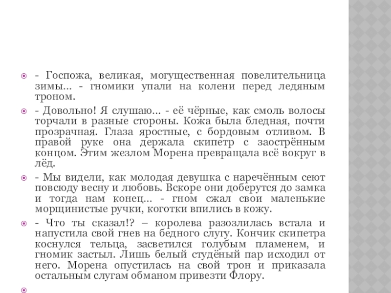 - Что ты сказал!? – королева разозлилась встала и напустила свой гнев на бедного слугу. Кончик скипетра коснулся тельца, засветился голубым пламенем, и гномик застыл. Лишь белый студёный пар исходил от него. Морена опустилась на свой трон и приказала остальным слугам обманом привезти Флору.