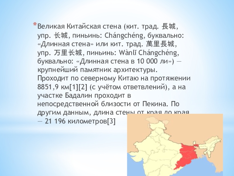 Великая Китайская стена (кит. трад. 長城, упр. 长城, пиньинь: Chángchéng, буквально: «Длинная стена» или кит. трад. 萬里長城,