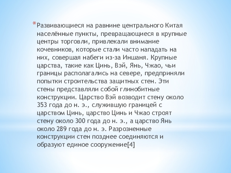 торговли, привлекали внимание кочевников, которые стали часто нападать на них, совершая набеги из-за Иншаня. Крупные царства, такие как Цинь, Вэй, Янь, Чжао, чьи границы располагались на севере, предприняли попытки строительства защитных стен. Эти стены представляли собой глинобитные конструкции. Царство Вэй возводит стену около 353 года до н. э., служившую границей с царством Цинь, царство Цинь и Чжао строят стену около 300 года до н. э., а царство Янь около 289 года до н. э. Разрозненные конструкции стен позднее соединяются и образуют единое сооружение[4]