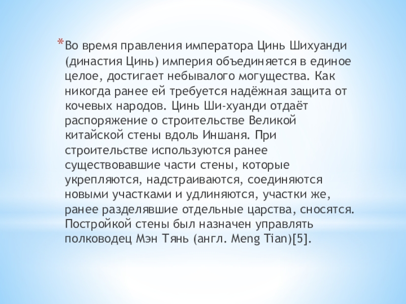 единое целое, достигает небывалого могущества. Как никогда ранее ей требуется надёжная защита от кочевых народов. Цинь Ши-хуанди отдаёт распоряжение о строительстве Великой китайской стены вдоль Иншаня. При строительстве используются ранее существовавшие части стены, которые укрепляются, надстраиваются, соединяются новыми участками и удлиняются, участки же, ранее разделявшие отдельные царства, сносятся. Постройкой стены был назначен управлять полководец Мэн Тянь (англ. Meng Tian)[5].
