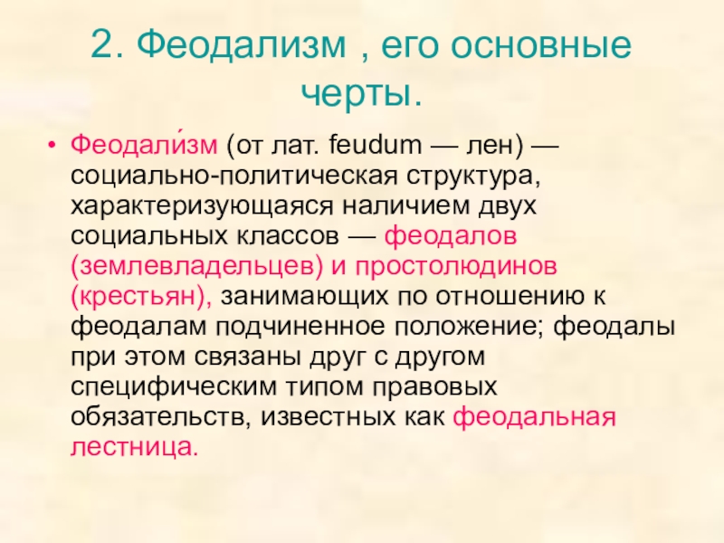 лен) — социально-политическая структура, характеризующаяся наличием двух социальных классов — феодалов (землевладельцев) и простолюдинов (крестьян), занимающих по отношению к феодалам подчиненное положение; феодалы при этом связаны друг с другом специфическим типом правовых обязательств, известных как феодальная лестница.