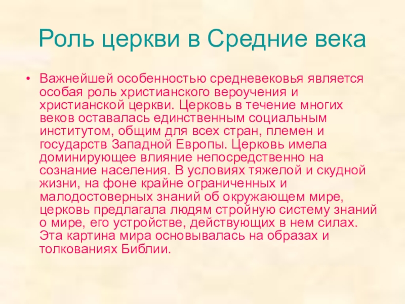 вероучения и христианской церкви. Церковь в течение многих веков оставалась единственным социальным институтом, общим для всех стран, племен и государств Западной Европы. Церковь имела доминирующее влияние непосредственно на сознание населения. В условиях тяжелой и скудной жизни, на фоне крайне ограниченных и малодостоверных знаний об окружающем мире, церковь предлагала людям стройную систему знаний о мире, его устройстве, действующих в нем силах. Эта картина мира основывалась на образах и толкованиях Библии.