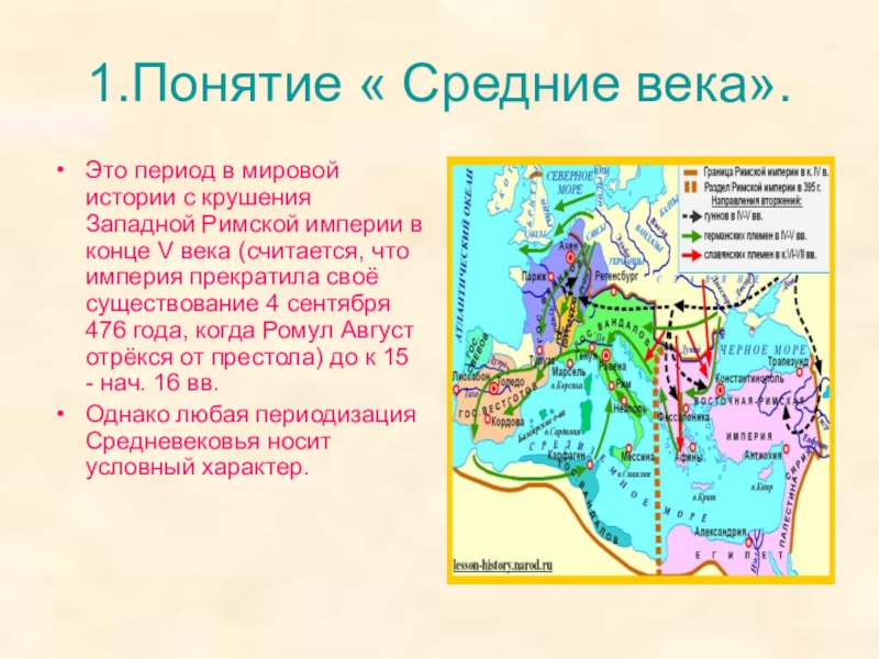 Римской империи в конце V века (считается, что империя прекратила своё существование 4 сентября 476 года, когда Ромул Август отрёкся от престола) до к 15 - нач. 16 вв.