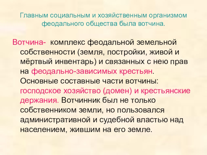 земельной собственности (земля, постройки, живой и мёртвый инвентарь) и связанных с нею прав на феодально-зависимых крестьян. Основные составные части вотчины: господское хозяйство (домен) и крестьянские держания. Вотчинник был не только собственником земли, но пользовался административной и судебной властью над населением, жившим на его земле.