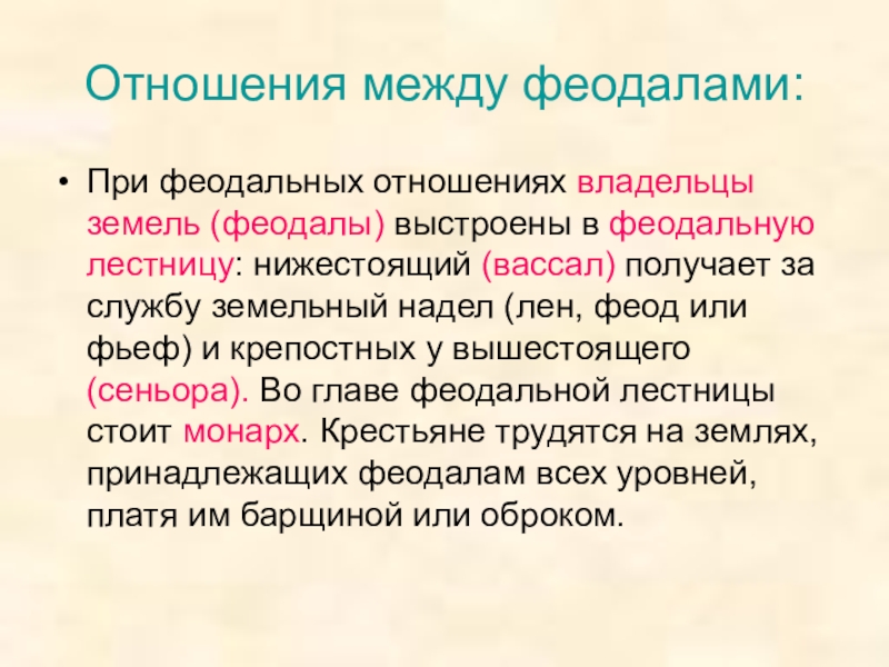 лестницу: нижестоящий (вассал) получает за службу земельный надел (лен, феод или фьеф) и крепостных у вышестоящего (сеньора). Во главе феодальной лестницы стоит монарх. Крестьяне трудятся на землях, принадлежащих феодалам всех уровней, платя им барщиной или оброком.