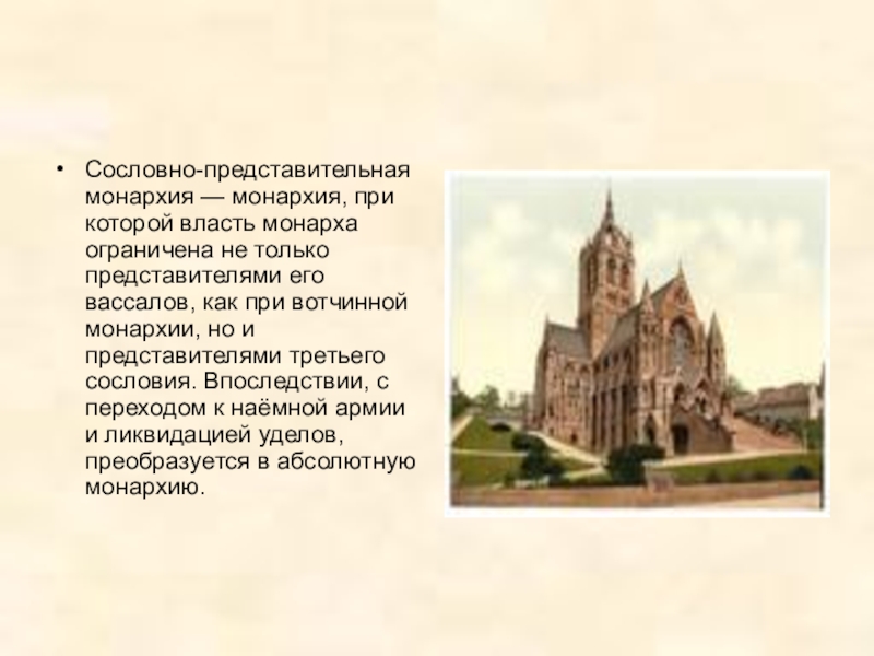 Слайд 21Сословно-представительная монархия — монархия, при которой власть монарха ограничена не только