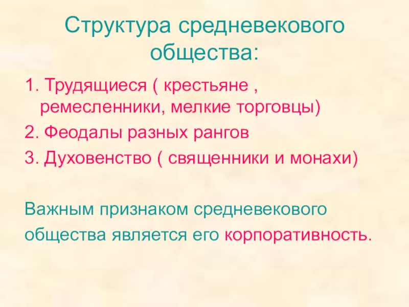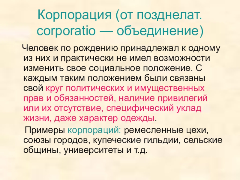 Примеры корпораций: ремесленные цехи, союзы городов, купеческие гильдии, сельские общины, университеты и т.д.