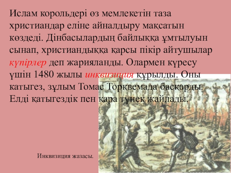 байлыққа ұмтылуын сынап, христиандыққа қарсы пікір айтушылар күпірлер деп жарияланды. Олармен күресу үшін 1480 жылы инквизиция құрылды. Оны катыгез, зұлым Томас Торквемада басқарды. Елді қатыгездік пен қара түнек жайлады.