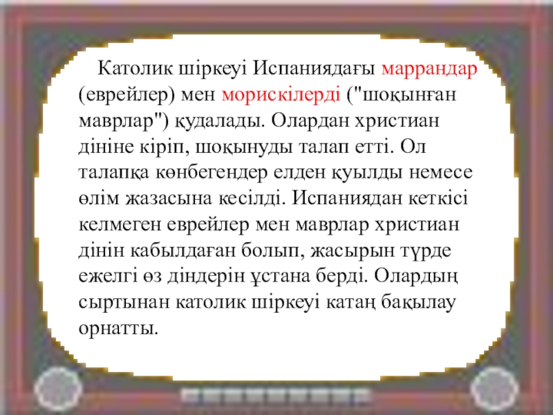Слайд 16 Католик шіркеуі Испаниядағы маррандар (еврейлер) мен морискілерді ("шоқынған