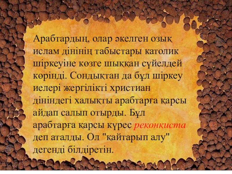 сүйелдей көрінді. Сондықтан да бұл шіркеу иелері жергілікті христиан дініндегі халықты арабтарға қарсы айдап салып отырды. Бұл арабтарға қарсы күрес реконкиста деп аталды. Ол "қайтарып алу" дегенді білдіретін.