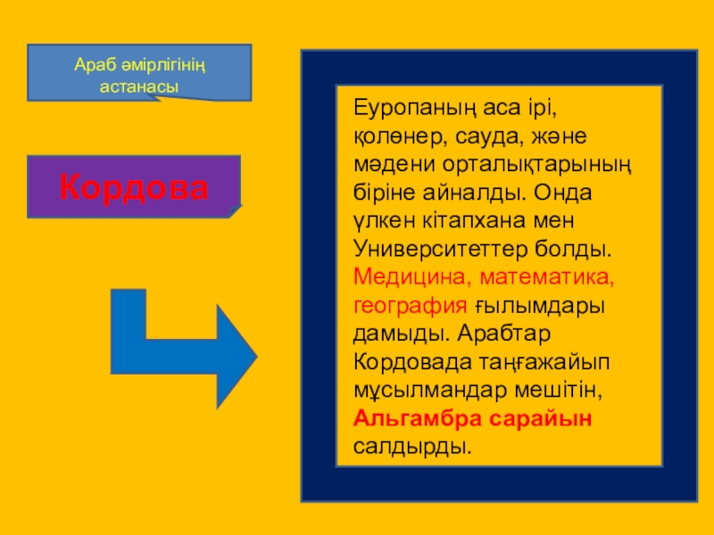 айналды. Онда үлкен кітапхана мен Университеттер болды. Медицина, математика, география ғылымдары дамыды. Арабтар Кордовада таңғажайып мұсылмандар мешітін, Альгамбра сарайын салдырды.