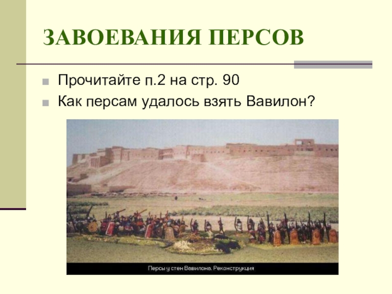 ЗАВОЕВАНИЯ ПЕРСОВПрочитайте п.2 на стр. 90Как персам удалось взять Вавилон?