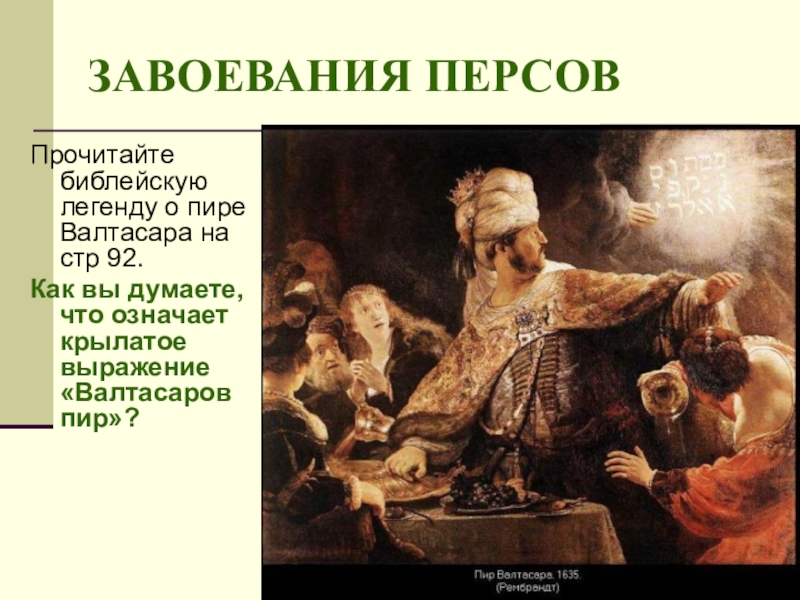 ЗАВОЕВАНИЯ ПЕРСОВПрочитайте библейскую легенду о пире Валтасара на стр 92.Как вы думаете, что означает крылатое выражение «Валтасаров