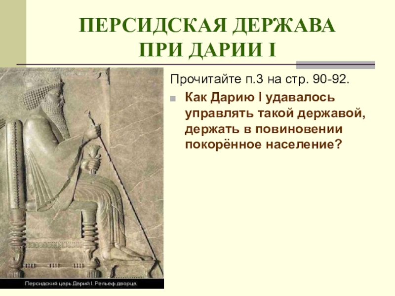ПЕРСИДСКАЯ ДЕРЖАВА  ПРИ ДАРИИ IПрочитайте п.3 на стр. 90-92.Как Дарию I удавалось управлять такой державой, держать