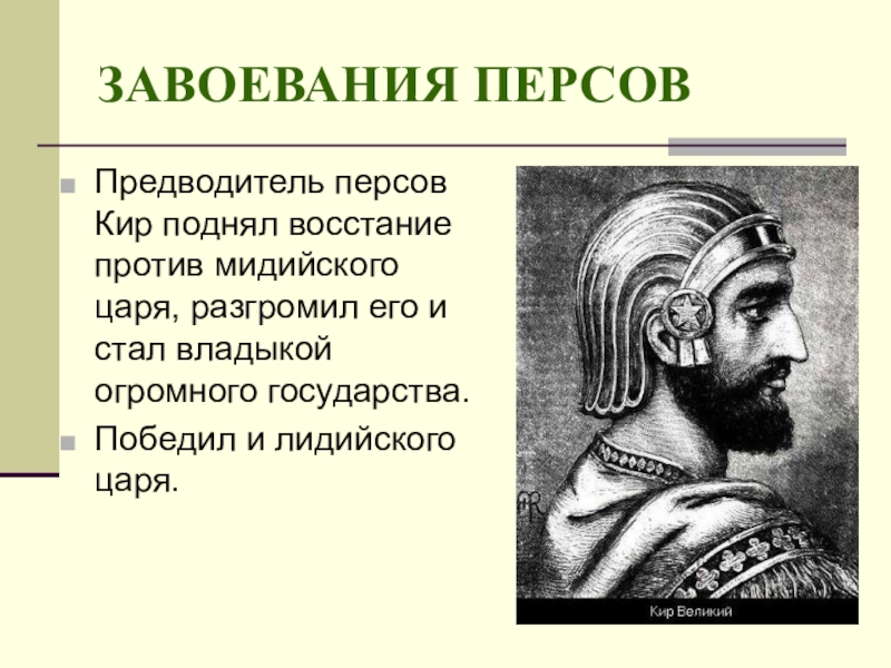 ЗАВОЕВАНИЯ ПЕРСОВПредводитель персов Кир поднял восстание против мидийского царя, разгромил его и стал владыкой огромного государства.Победил и