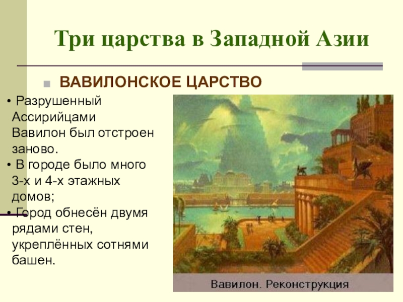 Три царства в Западной АзииВАВИЛОНСКОЕ ЦАРСТВО Разрушенный Ассирийцами Вавилон был отстроен заново. В городе было много 3-х и 4-х этажных домов; Город обнесён двумя рядами стен, укреплённых сотнями башен.