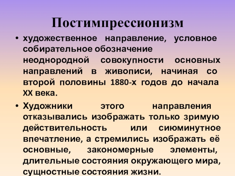Художники этого направления отказывались изображать только зримую действительность или сиюминутное впечатление, а стремились изображать её основные, закономерные элементы, длительные состояния окружающего мира, сущностные состояния жизни.