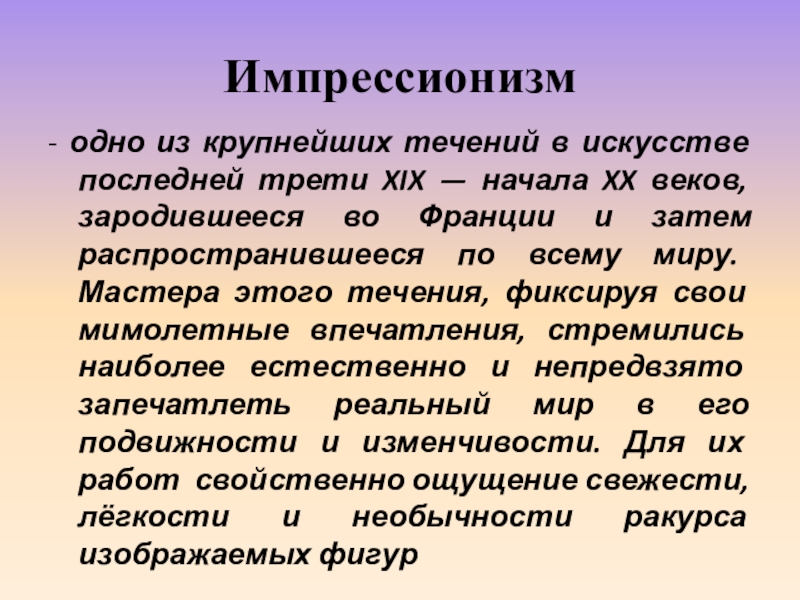 начала XX веков, зародившееся во Франции и затем распространившееся по всему миру. Мастера этого течения, фиксируя свои мимолетные впечатления, стремились наиболее естественно и непредвзято запечатлеть реальный мир в его подвижности и изменчивости. Для их работ свойственно ощущение свежести, лёгкости и необычности ракурса изображаемых фигур