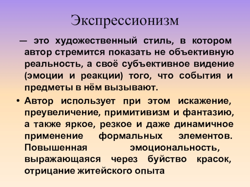 Автор использует при этом искажение, преувеличение, примитивизм и фантазию, а также яркое, резкое и даже динамичное применение формальных элементов. Повышенная эмоциональность, выражающаяся через буйство красок, отрицание житейского опыта