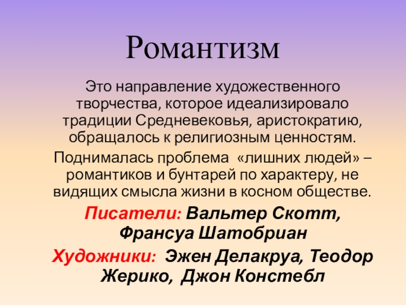 Это направление художественного творчества, которое идеализировало традиции Средневековья, аристократию, обращалось к