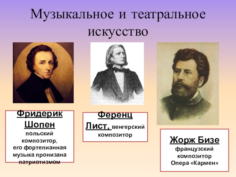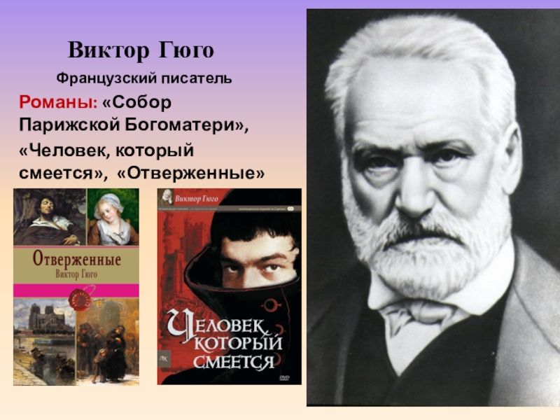 Писатели: Виктор Гюго, Стендаль, Оноре де Бальзак, Проспер Мериме, Чарлз Диккенс, Гарриет Бичер-Стоу, Генрик Ибсен
